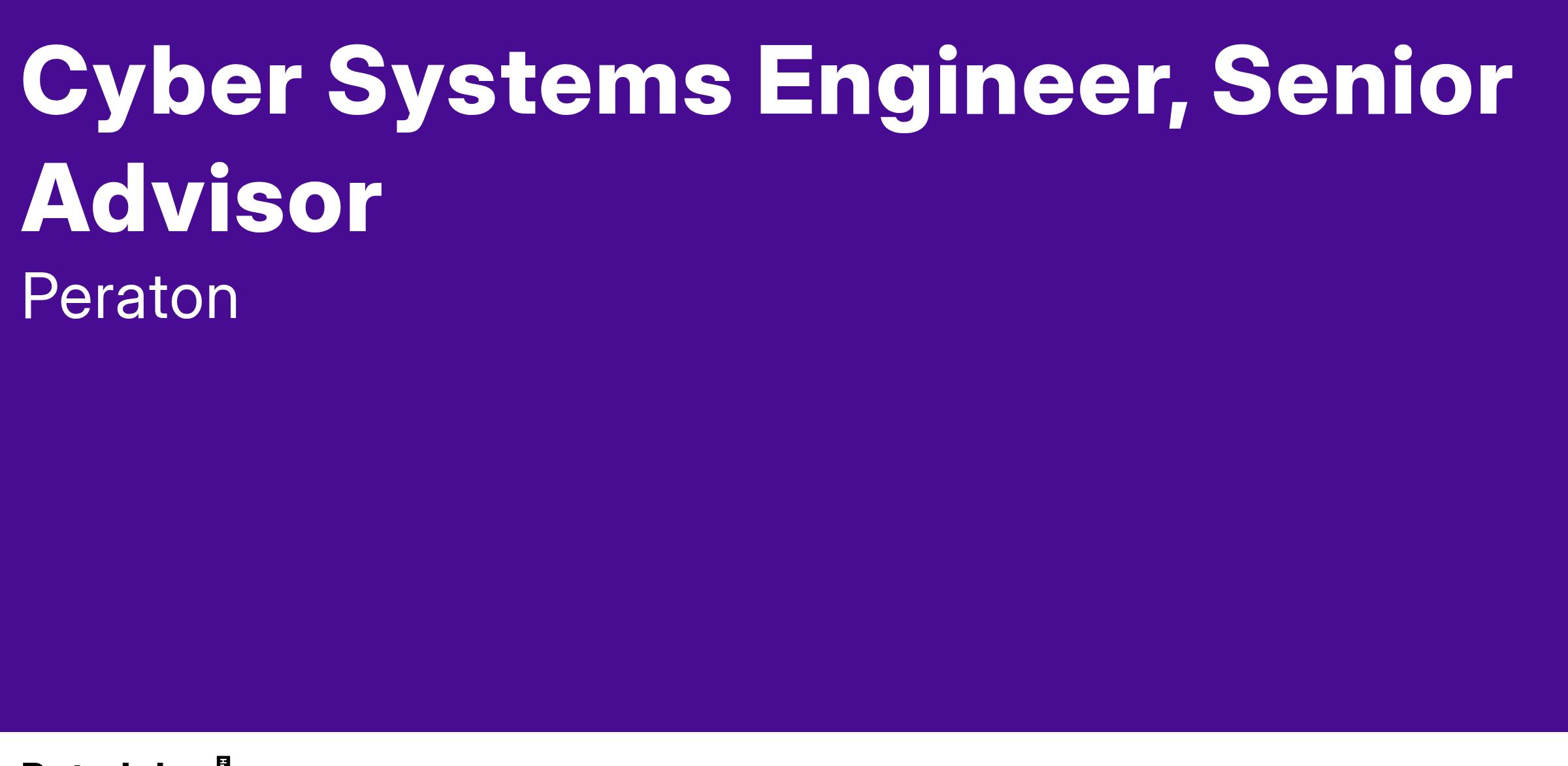 Peraton is a next-generation national security company that drives missions of consequence spanning the globe and extending to the farthest reaches of the galaxy. As the worldβs leading mission capability integrator and transformative enterprise IT provider, we deliver trusted, highly differentiated solutions and technologies to protect our nation and allies. Peraton operates at the critical nexus between traditional and nontraditional threats across all domains: land, sea, space, air, and cyberspace. The company serves as a valued partner to essential government agencies and supports every branch of the U.S. armed forces. Each day, our employees do the canβt be done by solving the most daunting challenges facing our customers. Visit peraton.com to learn how weβre keeping people around the world safe and secure.