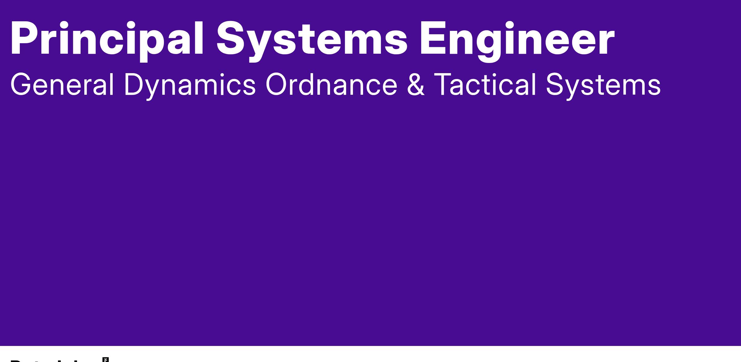 General Dynamics Ordnance and Tactical Systems (GD-OTS), a premier provider of ordnance weapons and tactical systems to the U.S. Department of Defense and allied nations, has an opening for an onsite Principal Systems EngineerΒ to join our Bothell, WA / St. Petersburg, FLΒ team. We take pride in supporting the mission of the warfighter by delivering the best, to the best. Our products can be found with every U.S. military branch and with allies around the world. We are looking for a motivated and creative leader to help shape and support our mission.