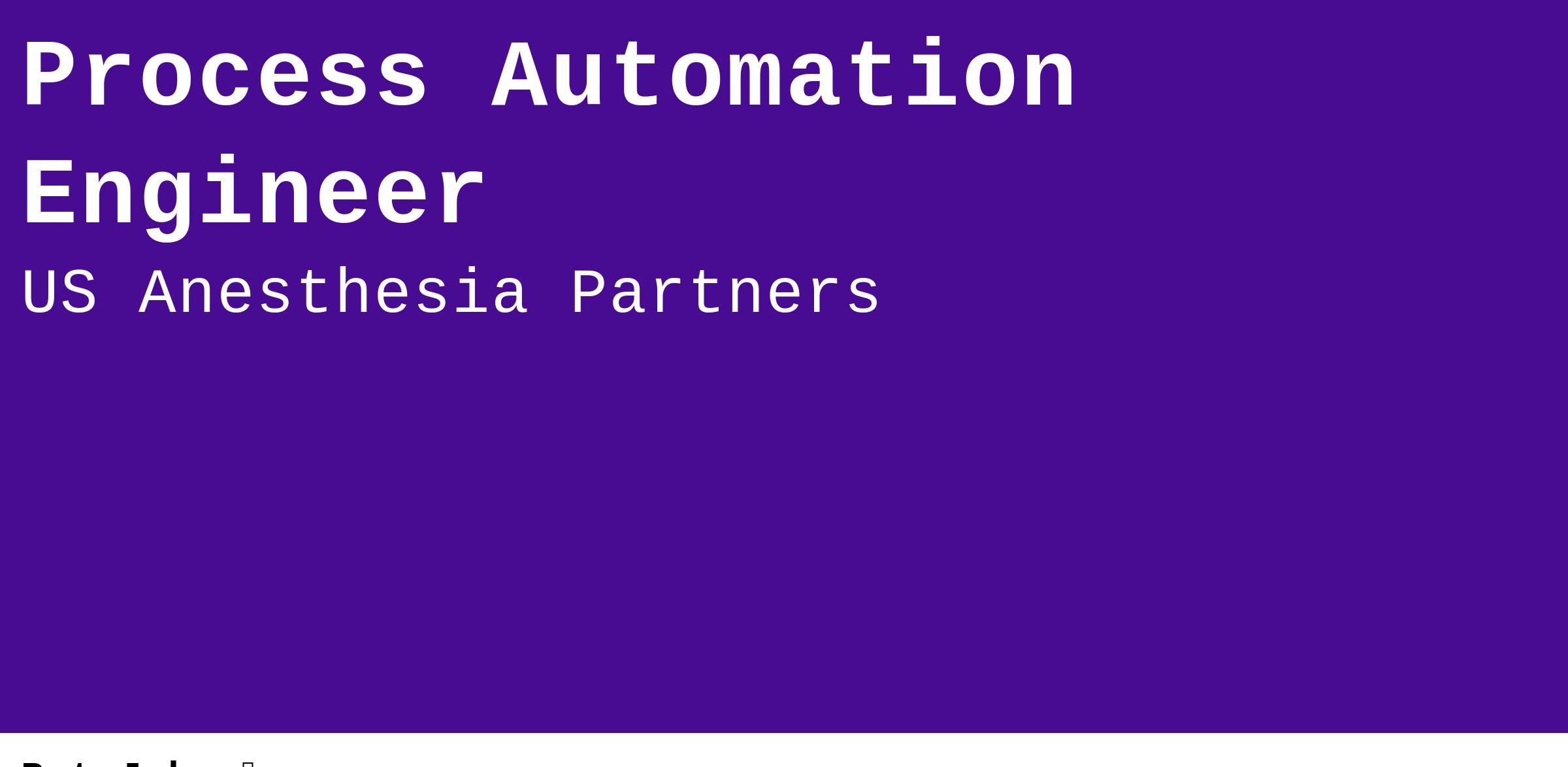US Anesthesia Partners is the highest-quality single-specialty anesthesia practice in the United States, with over 6,000 employees distributed across 12 states. Our clinical and non-clinical staff support each other as they work toward a common vision: Empowering people to advance exceptional care. The Process Automation Engineer is responsible for designing, developing, and implementing automation solutions based primarily on UiPath and QuickBase technology. These solutions reside in both cloud and in on premises environments across various areas of the business that will address complex challenges. Working closely with cross-functional teams and project stakeholders, the Process Automation Engineer will ensure that the automation follows all USAP architecture and enterprise technical standards. This role requires extensive knowledge and understanding of UiPath architecture, software development practices, well architected frameworks, as well as the ability to solve complex technical challenges.